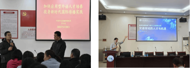 将形势政策分析与学科发展研判相结合。邀请校内外专家就高等教育发展、国际形势、国家战略需求等作专题报告,帮助教职工拓宽视野,明确个人发展与国家需要、学院发展的结合路径,提升服务大局的意识和能力。全年举办红“译”站讲坛15场。