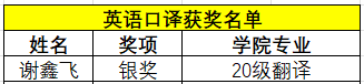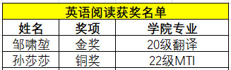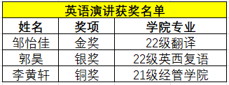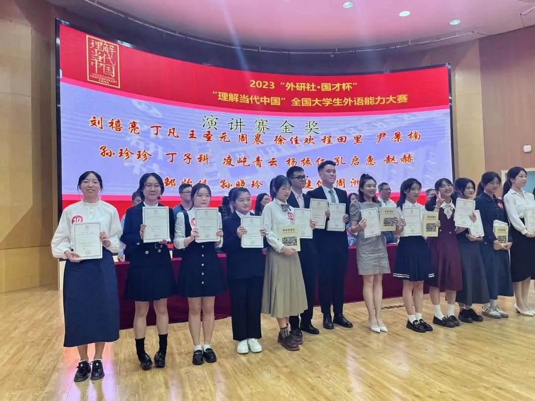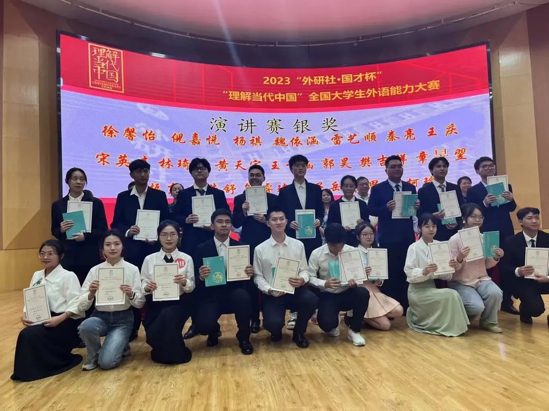 本次大赛,通过线上和线下两轮初赛的激烈角逐,我校共有9名学子荣获佳绩。22级翻译专业邹怡佳在演讲比赛中荣获金奖并成功晋级全国决赛,20级翻译专业邹啸堃在阅读比赛荣获金奖并成功晋级全国决赛。